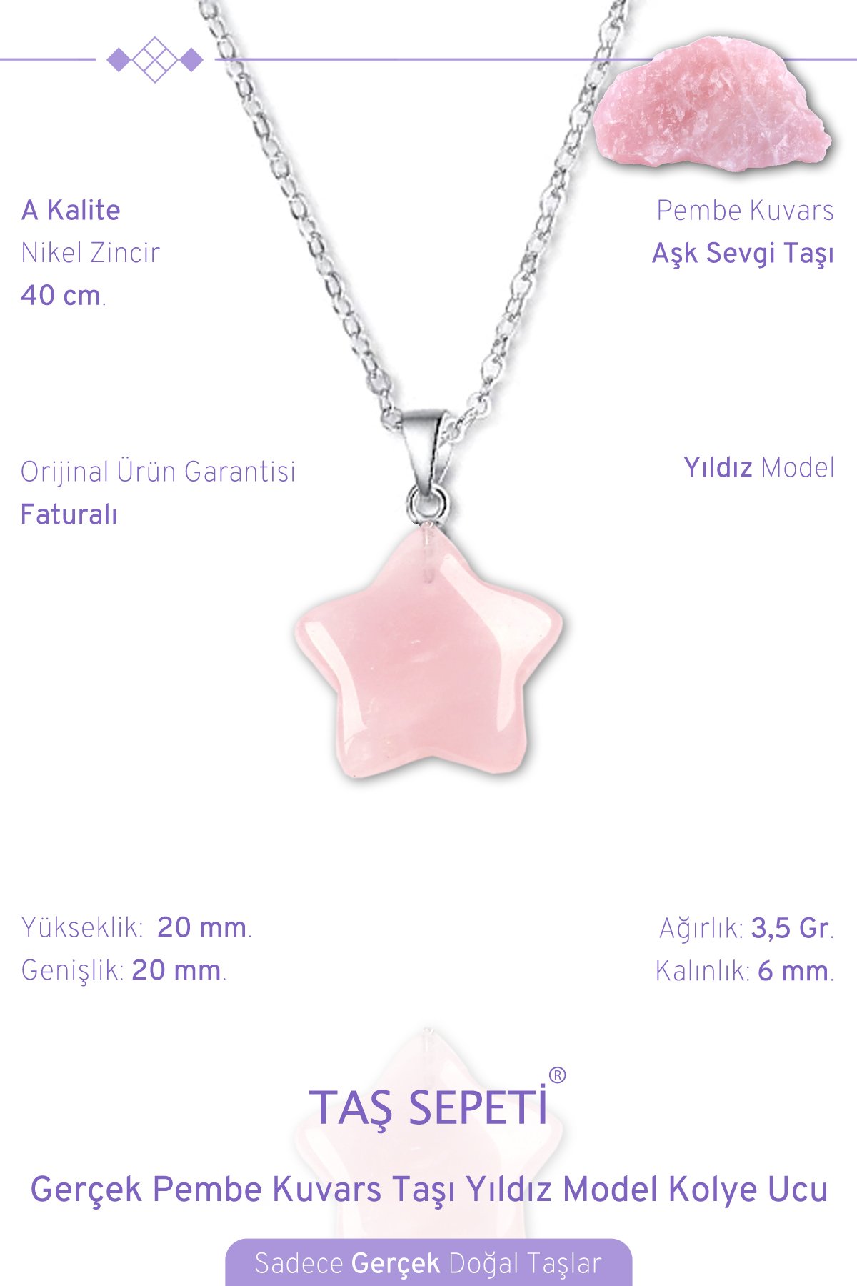 Gerçek Pembe Kuvars Doğal Taşı Yıldız Model Zincirli Kolye Ucu